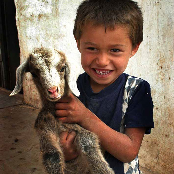 A young boy from Tajikistan holding a goat in 2006. Photo by Steve Evans.