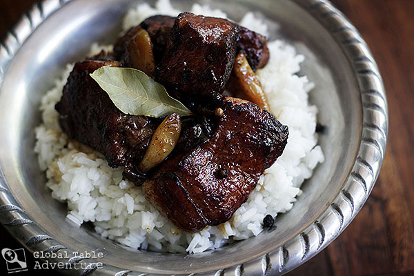 Sometimes I have to play games to get through a busy day with a smile. Here are some good things that help me out (in no particular order): – watching the sun peek through the clouds. – listening to my shoes squeak in the library. – counting how often our daughter giggles. – feeling her small hand in mine. Other times it’s all about vinegar, slowly reduced with soy sauce and brown sugar, with a hit of black peppercorn and bay leaf. What? I know, I know. But it’s true. As a long time fan of Vinegar City, Pork Adobo is just right for those sweet and sour days which cling to us like paperweights. Whatever that means. The inspiration comes from our Filipino Global Table, which (in turn) was inspired by the cuisine of Portugal. It would seem adobo can be anything in sauce (particularly vinegar based), but pork adobo is particularly grand with pork belly or shoulder. In other words, any meat that is thick, fatty and wonderful on the slow and low side …
