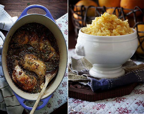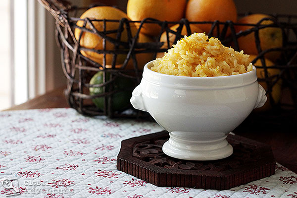 In Trinidad and Tobago they say “Don’t pick fruits after 6 p.m., the tree is sleeping.” I’m not exactly sure what the tree would do to retaliate if you interrupt its sleep … but I do know that when I don’t get my sleep, I’m not only gruffy, but I can’ t focus on anything. I’m so tired that my work suffers. I pout. I play with my hair. I pace rooms. I can’t bear fruit, so to speak. So. Let’s avoid picking fruit from the tree after six, both literally and figuratively. Instead, let’s enjoy fruit in our rice. I first read about orange rice in The World Cookbook for Students. Apparently, this is a popular side dish in parts of Trinidad and Tobago. And for good reason. When cooked with orange juice, rice becomes sweet, tangy, and makes the perfect complement to spicy food. Now. There is nothing subtle about replacing all the water with O.J., so if you’d like to start off with something more mild, try using half water (or broth) and half O.J. …