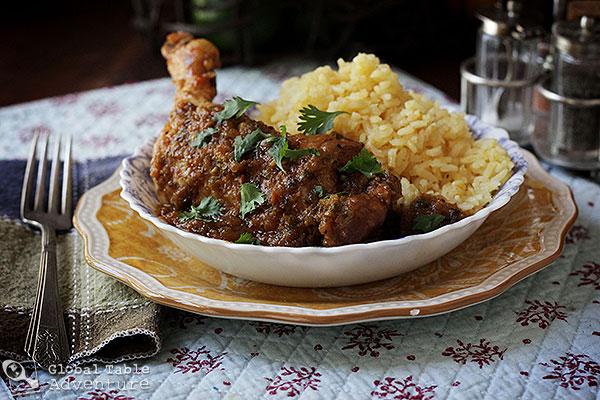 Many a good thing requires we throw our all into it. Swimming, for example. If we don’t swim with our all, well… we sink. Fast. When it comes to food from Trinidad and Tobago, adding a ton of flavor goes a long way to making unctuous and irresistible stew chicken. And when I say a “ton of flavor”, I mean, we’re going to throw our all into it. Just about everything your market (and your herb planter) has to offer goes into stew chicken. The basis of Stew Chicken is Green Seasoning. We made green seasoning back when we cooked Guyana. There are hundreds (thousands!) of recipes for green seasoning, so I thought it’d be fun to make up a second batch with this recipe. I used a different mix of herbs and aromatics, like ginger, garlic, tomato, green onion, and thyme. These flavors speak to Trinidad and Tobago’s preferences… and go wonderfully with this chicken. For this recipe, I used four whole chicken legs, which weighed about 2 lbs total. This sauce is enough to serve with 4 lbs …