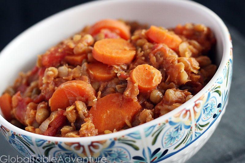 Serves 4 Let’s thank Eritrea for this giant, vegan bowl of deliciousness – a happy mixture of spicy lentils, offset by sweet carrots and tomatoes. The heat comes from berberé, the regional spice blend that should be added with a heavy hand. You know, for authenticity purposes. And lots of sweating. Edited to add: One of our readers posted a great tip in the comments section of our Ethiopian menu which also applies to Eritrean cooking: When I watch Ethiopian cooks in Ethiopia they chop up red onion very tiny (I use a food processor and stop short of pulverizing as it helps it cook down faster) and then dry cook it in the pan — no oil. They dry cook it stirring constantly until it turns almost into a paste — imagine the consistency of a good roux. It takes a lot of onion to get the right amount of this paste. Then add the oil/lentils, sauce stuff, etc. The onion paste is actually the thickener for the wat — if you don’t do …