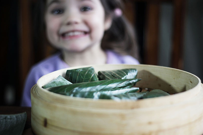THE SCENE Ava presses the back of the spoon on the rice, smashing it down into the banana leaf. She looks up at me and smiles. “Mmmm” “Looks good!” I say, watching her sneak a bite of the par-cooked rice before adding another spoonful to the cone. Later, when we eat dinner, Ava wolfs down three sticky rice towers – taking care to balance each one on end first. There are so many fun foods for kids in this great, big world. There’s no reason to get stuck in a processed junk food rut. These towers of coconut rice (called lemang) from Malaysia are a great example. Making them captivated little Ava, just two and a half years old, for a good hour, helping me, watching me, and playing with her finished work of art. The joy on her face is so beautiful. So much more sublime than what a little piece of candy can bring – that’s the kind of joy that fades almost the second she pops it into her mouth. There’s something about playing …
