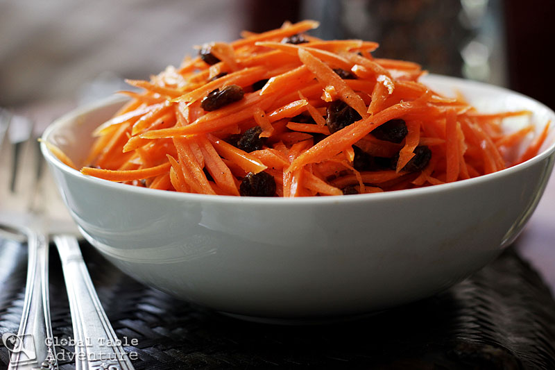 In Mongolia, the seemingly endless parade of meat, meat, and more meat, is only occasionally interrupted by vegetables. And, even then, relief doesn’t come with a garden salad, but rather some combination of root vegetables. This is because there really isn’t a whole lot of good farmland in the giant, cold, central Asian country – only the hardiest specimens make it. In the big city, versions of this simple carrot salad can be found, either dressed in a vinaigrette (as I have done) or in a mayonnaise/sour cream based dressing. So head to the market with me, and let’s stove top travel over to Mongolia! (Can you find the carrots in this picture?) Serves 4-6 Ingredients: 1 lb carrots, grated or julienned (on a mandolin is easiest) 1/2 cup raisins, soaked in hot water For the dressing: 1 large clove of garlic, grated 3 tablespoons vegetable oil 2 tablespoons white wine vinegar 1 1/2 teaspoons of sugar salt & pepper, to taste (be sure to use plenty of salt to bring out the flavors) Method: After picking up some …