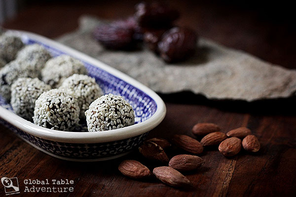 When I made the amazing Pistachio Date Balls for Iraq, I thought I’d seen the easiest recipe in the world.  It only uses two ingredients (third if you feel like getting extra fancy), and there’s no cooking. Well, today’s date balls are even easier: they don’t require a food processor. Boom! Even as simple as they are, the flavor is amazing – as though from a much more complex recipe. There’s a sweetness from the dates that transports me straight to Yemen… I mean, forget it. Let’s just lay under some Yemeni trees for a while, before we get around to making this recipe. Okay? Now, maybe this sunny afternoon in Yemen has you wondering: why include almonds and sesame seeds? Why not just eat straight dates? Well, you know how good peanut butter is with jelly? The balance of the nuttiness with the fruity date in this dessert is similarly satisfying. And addicting. Before I knew, I ate three of these. And to think. When I started this adventure, I (thought) I hated dates. …