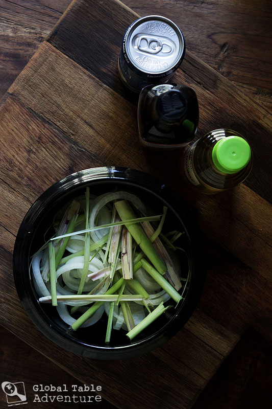 - First, make the broth. Add the coconut water (or regular water), rice vinegar, sugar, onion, and lemongrass to a medium pot. Be sure to bruise the lemongrass by bending and twisting it in your hands a few times. Bring to a boil, then remove from heat. As the lemongrass steeps in the broth, the flavor will grow stronger. Tip: you can store the broth for a day or two in the refrigerator. Right before serving, fry up the shallot and garlic in some oil, then top the broth with the toasted mixture.