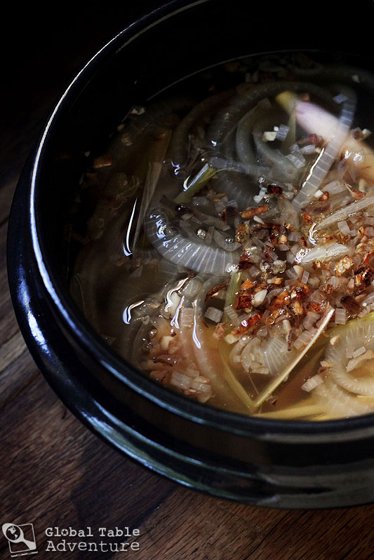 Right before serving, fry up the shallot and garlic in some oil, then top the broth with the toasted mixture.