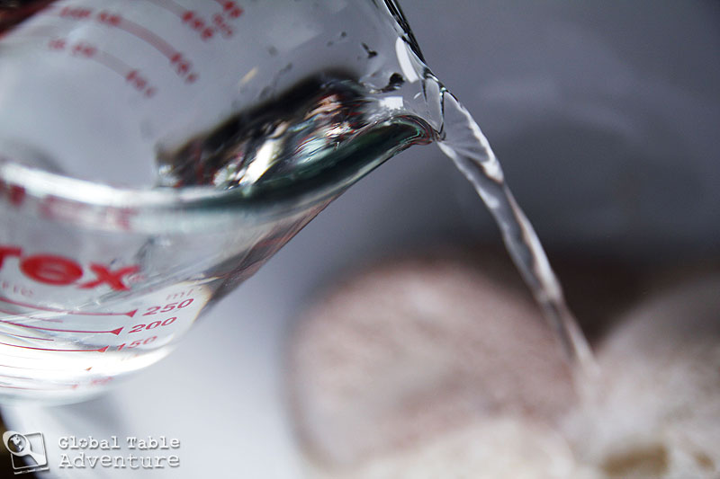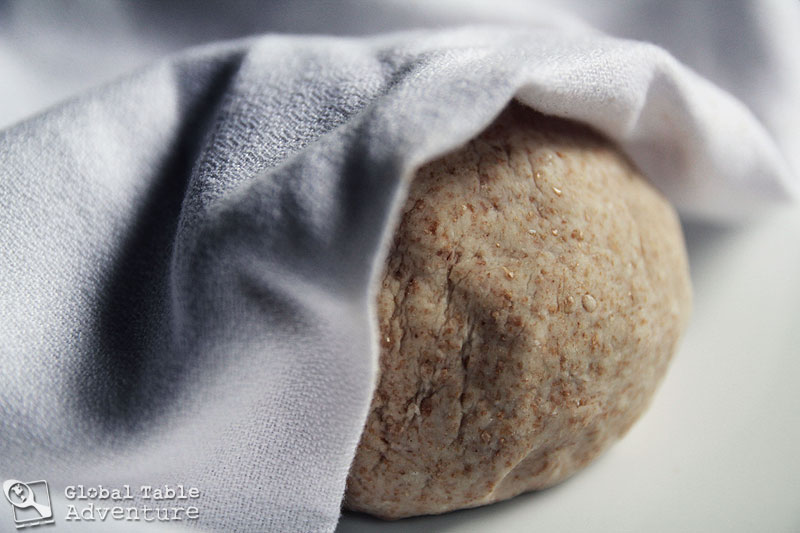 - Mix together the flours and salt in a medium bowl. Next, add hot water a little at a time until a soft ball forms. Knead for five minutes until smooth and elastic.
