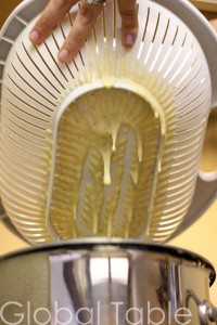 – The dough should be very thin, making it easy to pass through the holes. Bringing the noodles to your mouth should not be a weight lifting challenge.