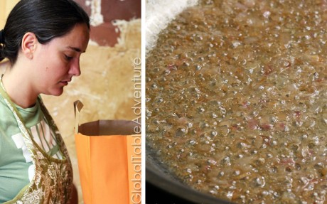 Cubed goat meat marinated with peanut butter and cayenne pepper, then layered with poblano peppers and onion in a banana leaf packet.