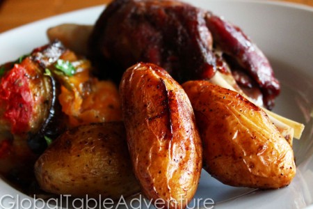 This dish is heavy on the olive oil – on purpose. It is a bit much for me, but Mr Picky quite liked it. Also – make sure you slit the potatoes. I forgot until near the end and, while the crust was flavorful – the insides just tasted of … baked potato. (Note – the more slits, the more oil and wine soak into the potatoes!)