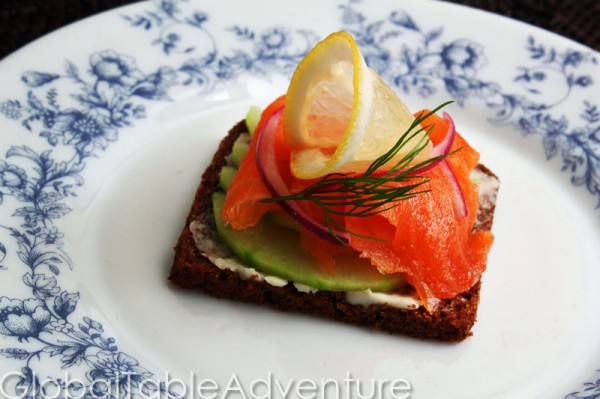 There are mountains of variations on smorrebrød – but they all have one thing in common: they are assembled with an eye for beauty. This particular recipe has a nice crunch from the cucumber and the lemony kick really makes the smoked salmon come alive.