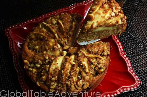 The cake itself was a bit dry. In the future I would add one chopped apple to the batter to moisten things up (I modified the recipe to indicate this). The only problem is getting the cooking time right once the second apple was in. Your ovens might vary, so check it with a toothpick. NOTE: I would still put the apple on top because it made for a great texture with the brown sugar and walnuts. Yum.