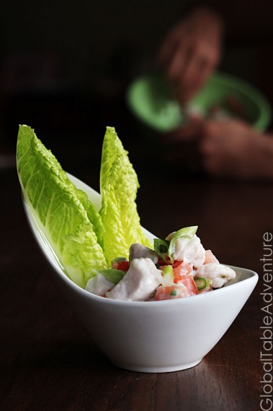 This was my first time making ceviche. I loved seeing fish transform from translucent to opaque white (the center remains uncooked though). I though the tart lime juice with the creamy coconut milk was a great compliment to the fish.