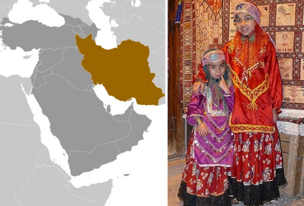 Map courtesy CIA World Factbook. Traditional clothing from Fars, Iran. Photo by Pentocelo.