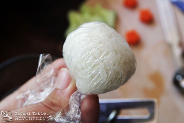 Fill the bento in with other finger foods – small tomatoes, grapes, steamed broccoli, and a ball of steamed rice – preferably sushi rice [Recipe].