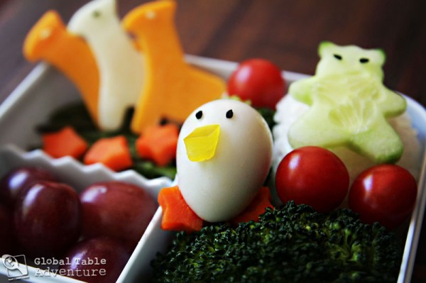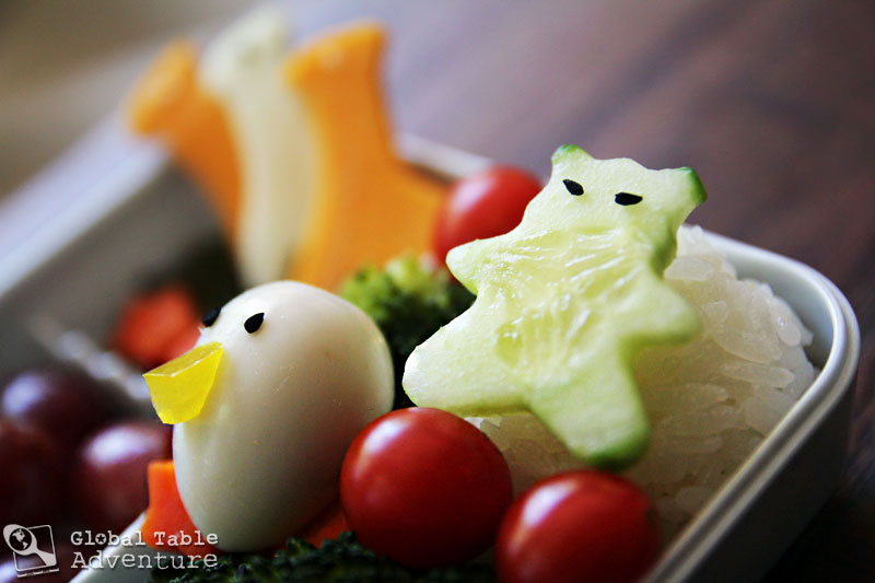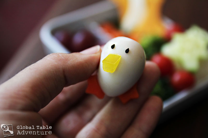 Then there’s the amazing trick of turning an egg into a bento duck. Add 2 carrot stars for feet and a bit of yellow pepper for the nose. You could use a quail egg or regular egg to make the duck. The seed eyes stick by dipping in a bit of water first. The nose can be stuck on with a dab of mayo or mustard. The carrot-star feet are stuck in small slits at the bottom of the egg.