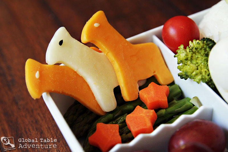 And cheese giraffes (use sesame seeds for eyes). Today our little cheese giraffes are walking on a bed of steamed asparagus and carrot stars. Adorable!