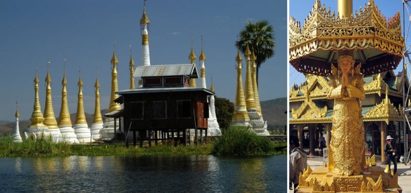 Inle Lake Monastery, photo by Bild von Stefan Grünig. Thagyamin statue at the Kyauktan Yay-Le Pagoda, photo by Hintha.