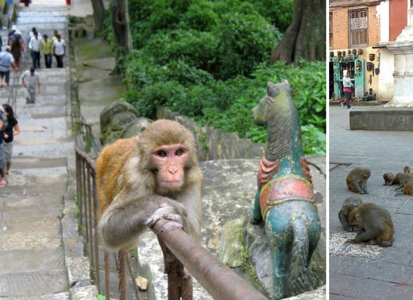 A Rhesus Macaque on Swayambhunath hill, Kathmandu Valley, Nepal . An ancient religious complex atop the hill in the Kathmandu Valley, west of Kathmandu city. It is also known as the Monkey Temple for the holy monkeys living in parts of the temple. Photo by Ester Inbar, available from http://commons.wikimedia.org/wiki/User:ST and monkeys in courtyard by Holynow.