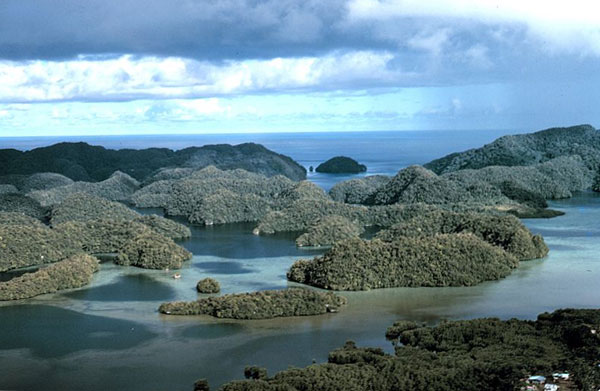 Aerial view of uplifted limestone islands, so called "Rock Islands" in Palau. Photo by Dr. James P. McVey, NOAA Sea Grant Program.