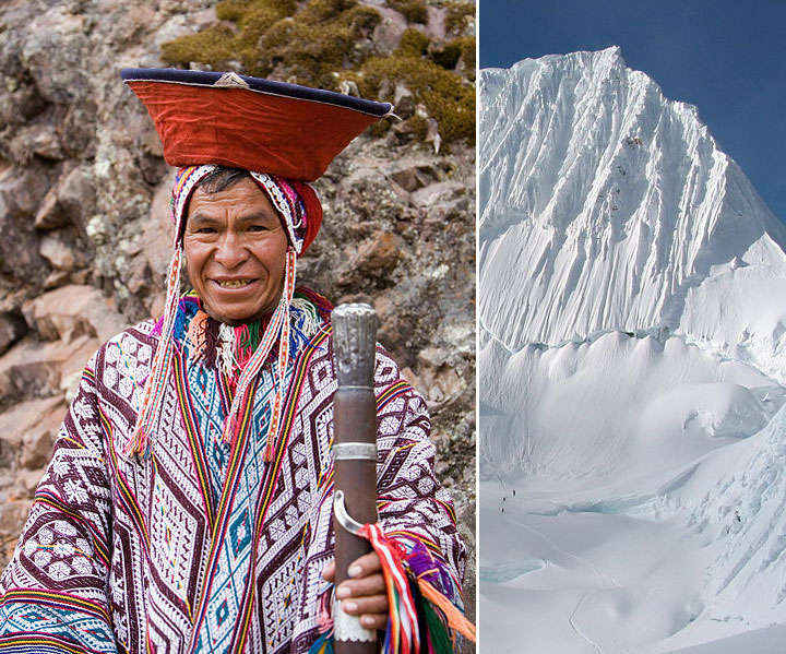 An Andean man in traditional dress. Pisac, Peru. Photo by Cacophony. Climbers on Alpamayo mountain in Peru. Photo by Brad Mering.