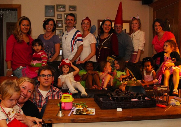 But here’s the crazy thing – halfway through the costume party I find out that one of the mothers I hang out with all the time (especially last year, when the girls were in the same class) actually lived in Qatar for years. Years! She was sitting right next to me as I told people about what I’d made to share. I almost fell over when she told us (she’s the one in the pink t-shirt, on the right in the group photo below).