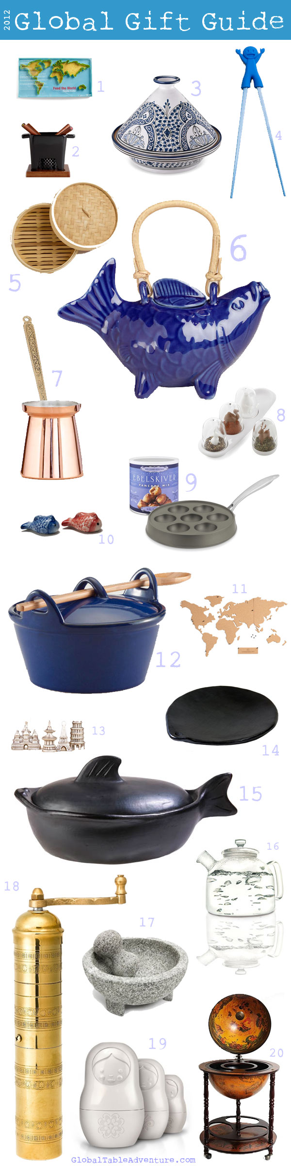 Hi, friends. Here’s a lip-smacking collection of gifts with the stovetop traveler in mind. You’ll find everything from kids chopsticks to a boozy liquor cabinet of global proportions.