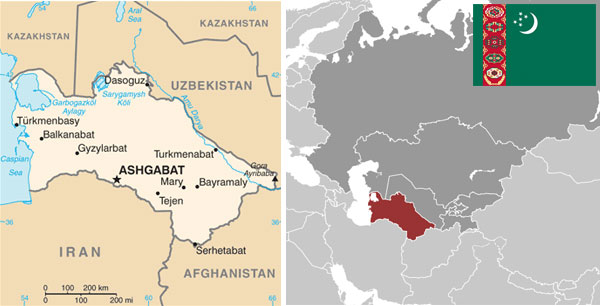 Maps and flag of Turkmenistan courtesy of the CIA World Factbook.