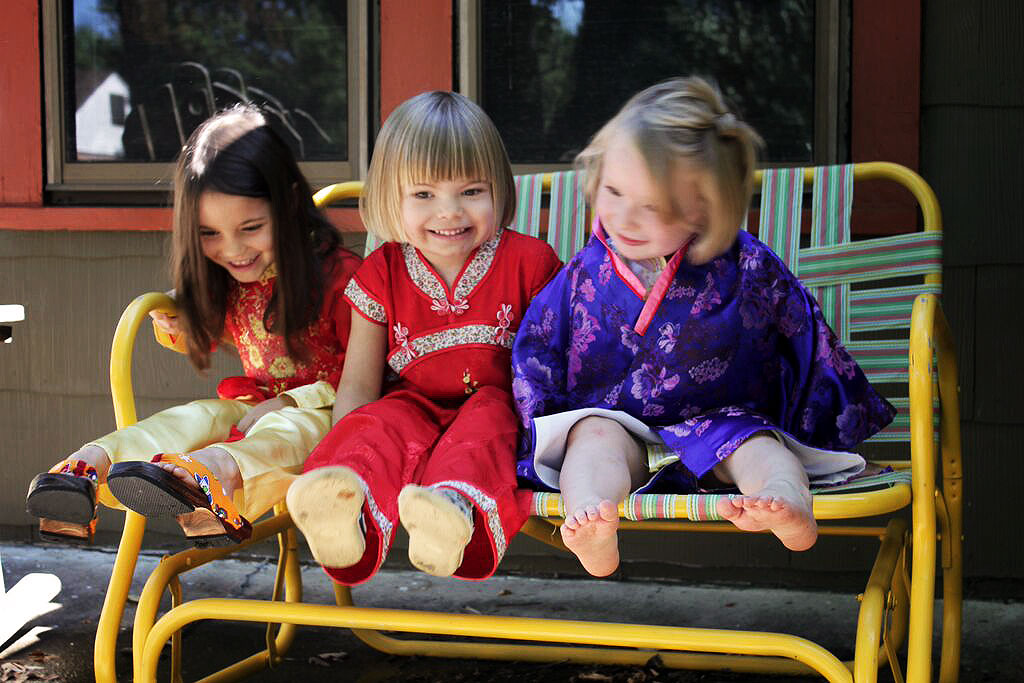 My daughter, below left, found her costume at our local Asian market… complete with wooden clogs. After the party these items were a great addition to her dress up chest!