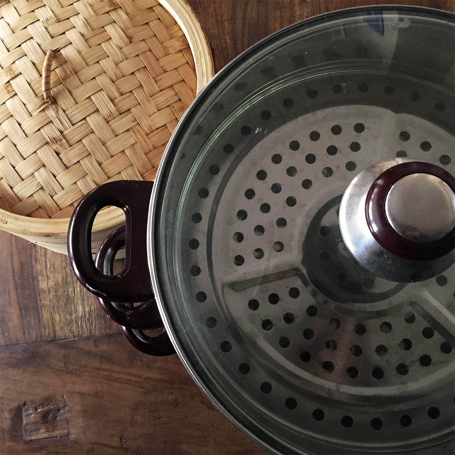 There were several times over the years of cooking the world that I had to steam food – as with fabulous coiled up pasta “Oromo” from Kyrgyzstan or vegetarian momos from Nepal. It’s worth investing in either a bamboo steamer or a tiered metal steamer for these types of meals. I found both at my local Asian market. The bamboo gives a nice woodsy flavor to steamed foods, while the stainless steel doesn’t impact taste at all.