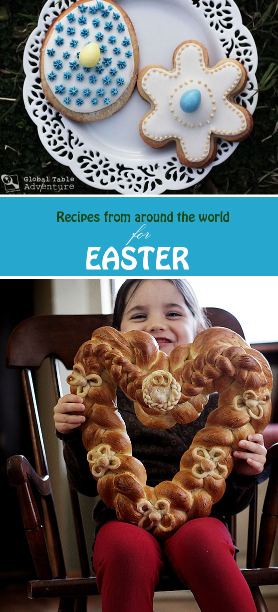 I always know when it’s Easter. My daughter is surrounded by a sea of plastic eggs. Jelly beans and skittles show up in the oddest places. But sometimes I want something a little less commercial. A little more homemade. And a whole lot delicious. Here are my three favorite Easter recipes from our Global Table Adventure… they are perfect for a fun afternoon of baking with your family, or go fancy and make them for brunch. 1. Easter Cookies, a.k.a. Figolla from Malta [Recipe] These lemon zest infused sugar cookies are stuffed with a marzipan filling, then iced. I love these so much, I even made them for a friend’s wedding. They are such a conversation starter, and it’s nifty they come from a tiny island in the Mediterranean (can we all just shut our eyes for a moment and just… go? 2. Romanian Easter Bread, a.k.a. Pasca [Recipe] Take everything you love about brioche and combine it with cheesecake. In spirit, anyway. This Romanian bread is gorgeous and would make excellent Easter Brunch (just …