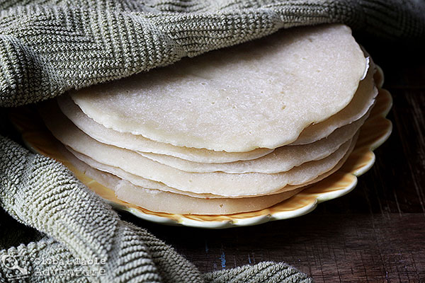 Gorraasa is a soft, doughy bread enjoyed in the Sudan that tastes like a really thick tortilla. The texture is a bit more spongy, however, and when I pulled mine into pieces, I was delighted to find the slight elasticity at once addicting and good for picking up food. Which is exactly how the Sudanese use Gorraasa. They place a round of Gorraasa under stewed meats or other entrees, then tear off bits of the bread to pick up the food instead of using utensils. It can also be enjoyed on its own… as Ava demonstrates here: I first learned about Gorraasa from Mark Tanner who spent quite a bit of time traveling through Sudan, though I found his recipe needed adjusting to work in my kitchen. Namely, more baking powder was needed to obtain the open holes (and if the batter happened to be too wet, the holes would pop before they set). Also, I found that, though he suggested flipping the Gorraasa while cooking, when I did so, the results no longer matched the photo …