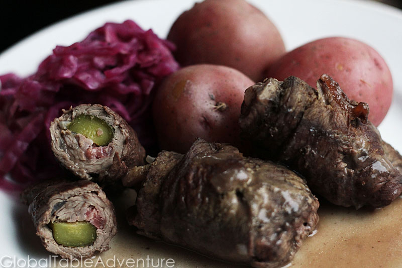 Serves 2-4 Welcome to Germany! Mustard, pickles, onions, bacon, and the beefiest beef you can find – all tucked into a luscious gravy and served with red cabbage [Recipe] and potatoes. First, a few tips. Rouladen should be made with wide strips of tough beef -the kind that benefits from slow cooking. Typically this is round steak, but my supermarket only had chuck roast. The meat should be about 4″ wide and very long and thin. Have your butcher cut it for you. If you think of the meat like a brick, they should be cutting strips from the widest part of the brick. They’ll only be able to do it if they have a slicer. Our butcher didn’t have a slicer, so they couldn’t cut wide slices – they had to cut from the skinny side. No problem – we just made mini rouladen. When you get it home pound it as thin as you can. Only simmer the rouladen until the beef is tender. You might want to make one or two extra …