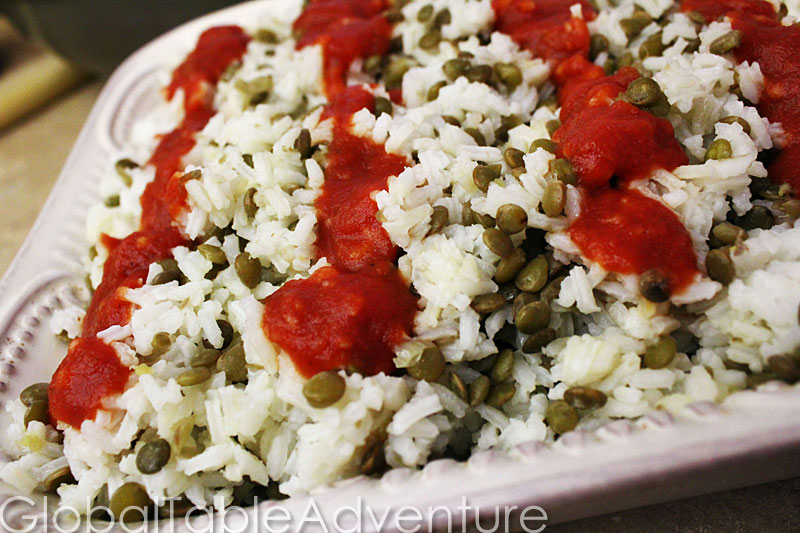 Serves 6 In Egypt, there are entire restaurants devoted soley to the production of Kushary. Giant vats are filled with the necessary ingredients and kept warm over low heat. With each order, a quick-moving server walks their ladle through the vats, filling the customer’s bowl up to the brim with pasta, rice, lentils, spicy tomato sauce, and fried onions. While it is difficult to reproduce this type of assembly at home, it is possible to layer all the ingredients in a casserole and keep warm. This is how we’ve approached this mega popular Egyptian dish. NOTE: If it seems a bit overwhelming, think about breaking this recipe up over a few days (make the pasta and sauce one day, the rice and lentils anther day…) just keep everything refrigerated until you’re ready to assemble. Ingredients: 1 cup dry macaroni 1/4 lb angel hair pasta, broken into 1-2″ pieces 1/8 cup olive oil 1 1/2 cups long grain rice 1/2 cup dry lentils Garnish: 1-2 onions, sliced thinly and pan-fried in olive oil 1 batch Spicy Egyptian …