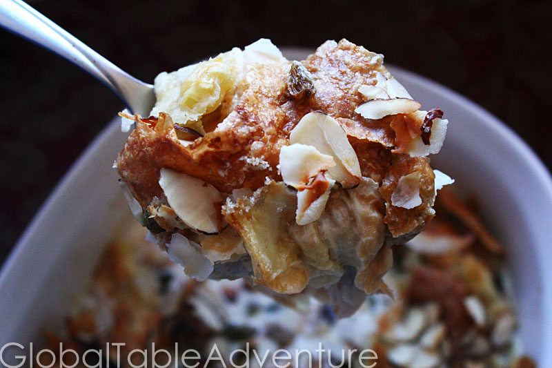 Serves 6 Egyptians have been eating Um Ali for hundreds of years. Clifford A. Wright tells the story well: One day while hunting in the Nile delta, the sultan developed a ravenous appetite and stopped in a small village. The peasants wished to please the sultan, so the best cook of the village, Umm Ali, pulled out a special pan and filled it with the only ingredients she had around: some dried wheat flakes, sultanas [raisins], nuts, and coconut. She covered it with sugar and milk and put it in the village’s oven. Excerpt from A Mediterranean Feast As simple as can be, this sweet, milky blend of pastry, nuts, raisins, and coconut flakes will be a distinct addition to your Egyptian Global Table. Ingredients: 1 sheet of puff pastry, baked 1/4 cup almonds 1/4 cup raisins 1/4 cup coconut chips (or 1/8 cup shredded coconut) 1/8 cup sugar 1 cup whole milk 1 cup half and half Method: Bake the puff pastry according to package directions. It will turn into a giant, greasy pillow. Try not …