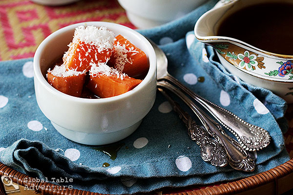 I love necklaces. The bright stones add a splash of color and fun to my generally plain-Jane outfits. Seeing as I don’t general have time to put on makeup, necklaces are the one and only way to brighten up my look. To make it look like I tried. Well, today, we’re getting a taste of how the islanders in Tonga dress up dinner. In short? Sweet potatoes meet coconut caramel sauce – a vivid display of orange, white, and golden brown. Sweet potatoes and coconut grow easily in the Pacific, making this dish ubiquitous in Tonga. In fact, from what I read, this coconut caramel sauce is on everything in Tonga, from dumplings to taro. Instant goodness. The caramel is just sugar and coconut milk (yay, for an accidentally vegan caramel sauce!). The coconut milk gives the caramel a depth of flavor butter can’t touch. It’s just so tropical. So dressed up. TIP: You can substitute boiled taro, or even boiled dumplings, for the sweet potato in this recipe. Ingredients: 2 lbs sweet potatoes (about 2-3) …