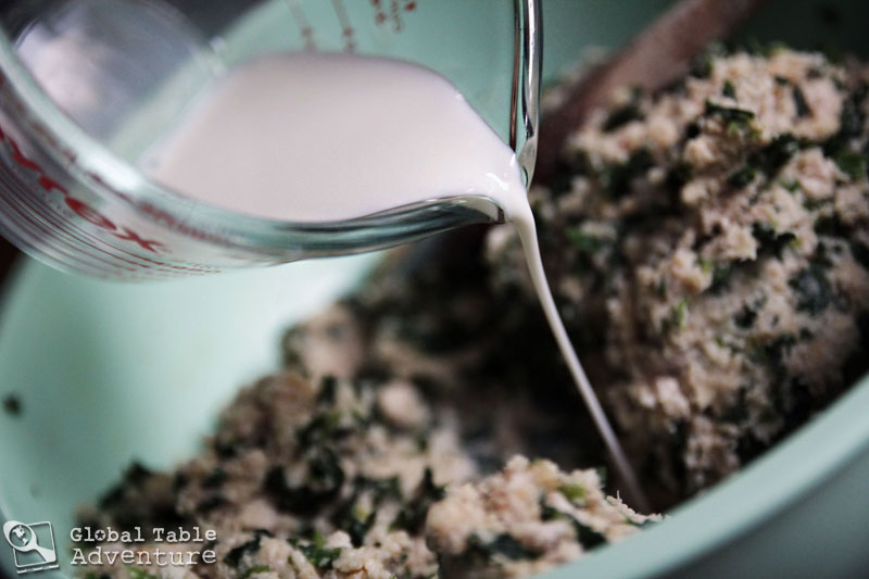 Next, mix pork with spinach, eggs, breadcrumbs, Parmesan, nutmeg, pepper, milk …