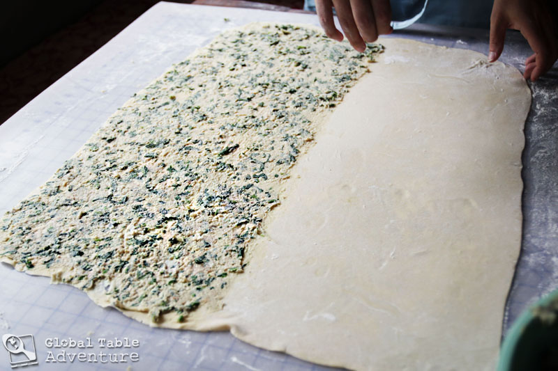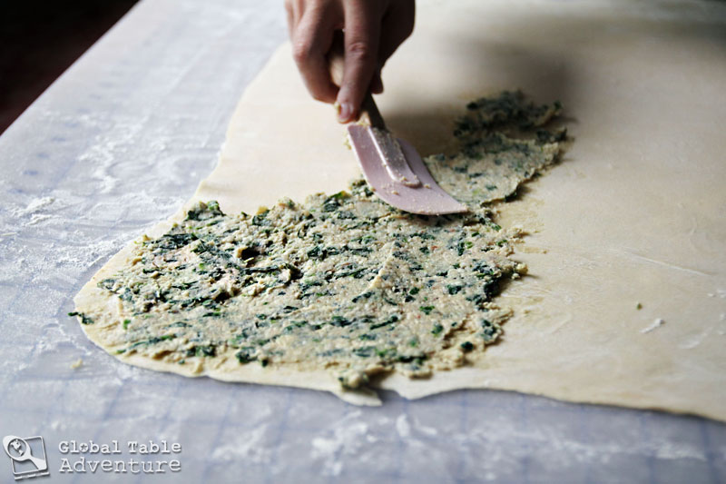 3. Continually dust with flour as you roll the dough out. Before you spread with filing, add a healthy amount of flour beneath the dough so the ravioli do not stick. The sheet of dough should easily slide around on the table, even as big as I rolled it. Proceed to spread with filling…