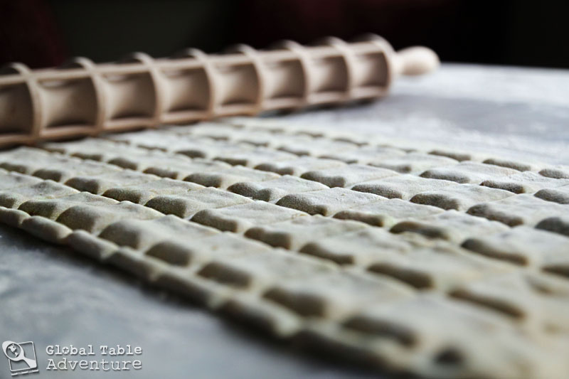 Next, line up the ravioli rolling pin in order to get the most ravioli out of the piece of dough you’re working with. Slowly roll and press firmly to crimp the ravioli well.
