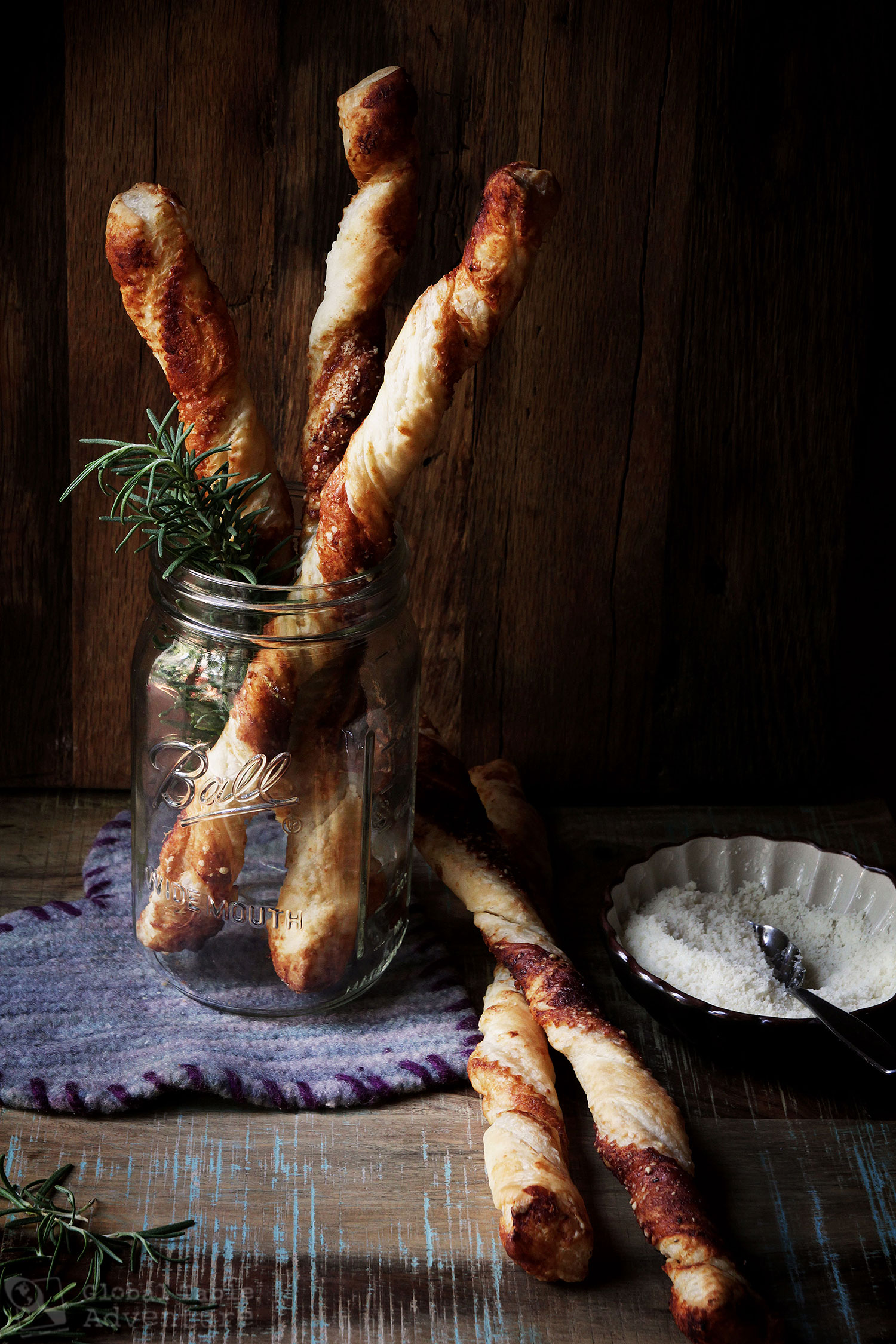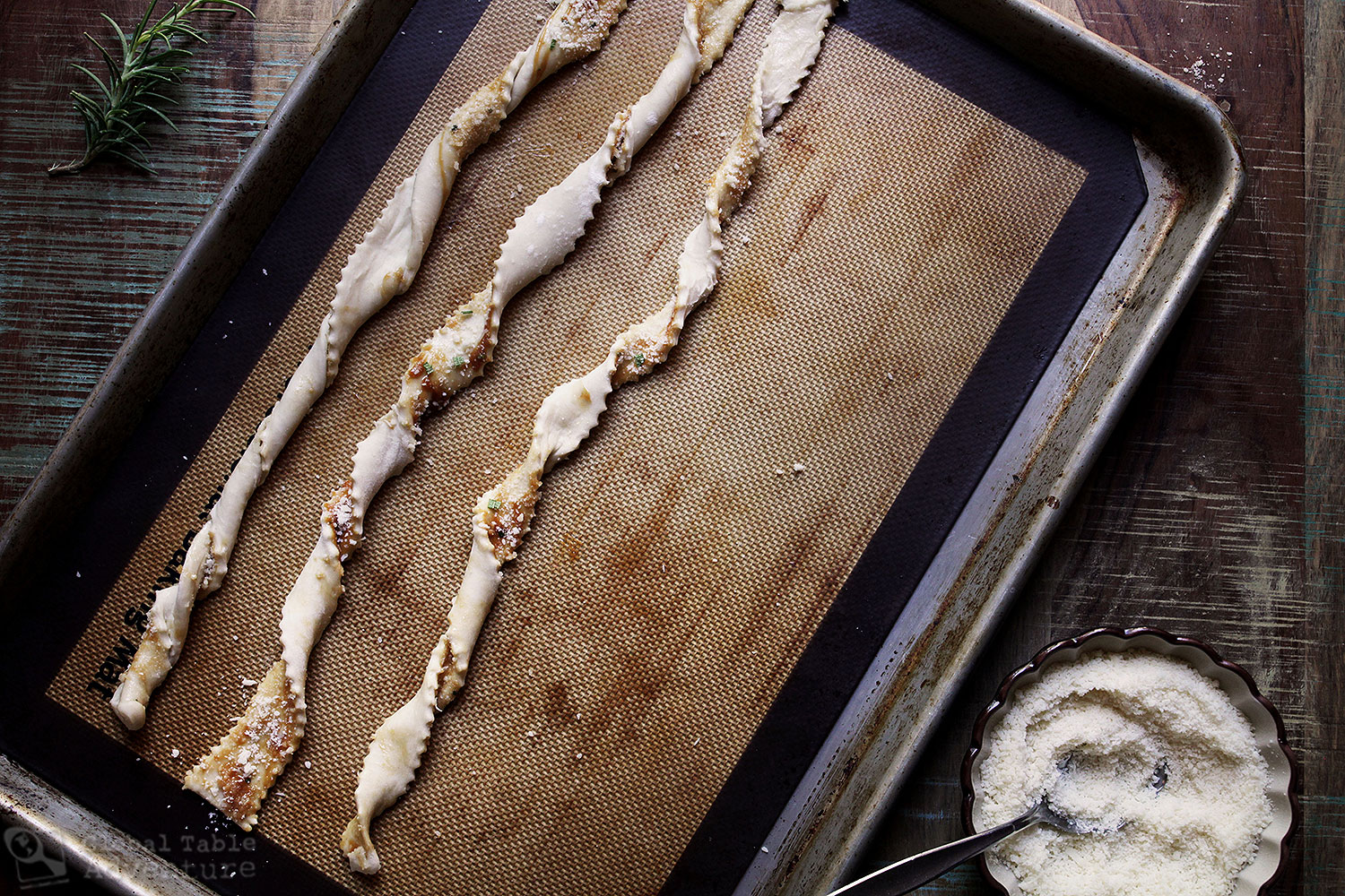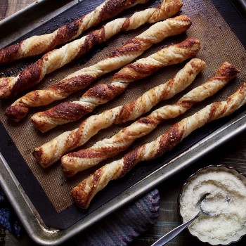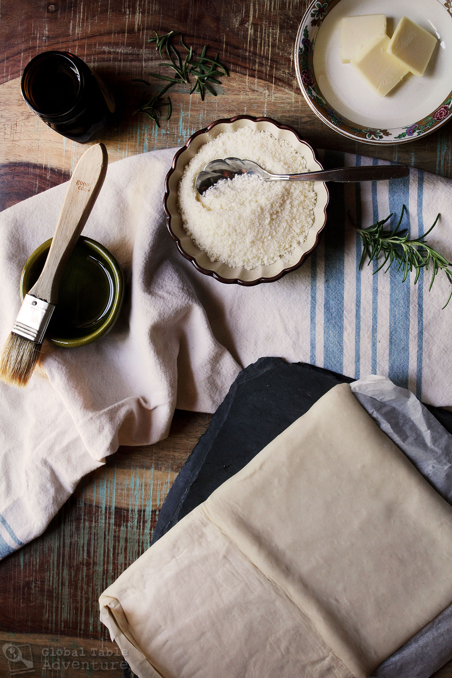 - Brush thawed puff pastry with vegetable oil. Mash together the butter, yeast extract, and rosemary. Spread on thawed puff pastry. Sprinkle liberally with Parmesan cheese. Cut in 10 strips (I used a ravioli wheel but a knife works well, too). Twist on a lined baking pan.