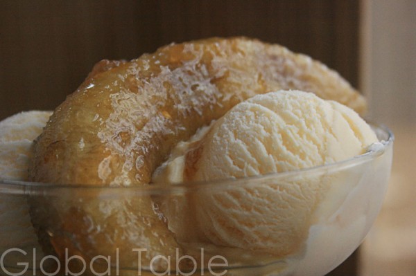 4. Transfer bananas to a serving dish. Pour rum over the bananas and carefully light on fire.