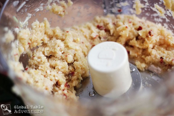 1. Chunk up the lemongrass, ginger, galangal, garlic, onion, and Japanese Chili peppers (if desired) and add to the bowl of a food processor. Blend into a fine paste.