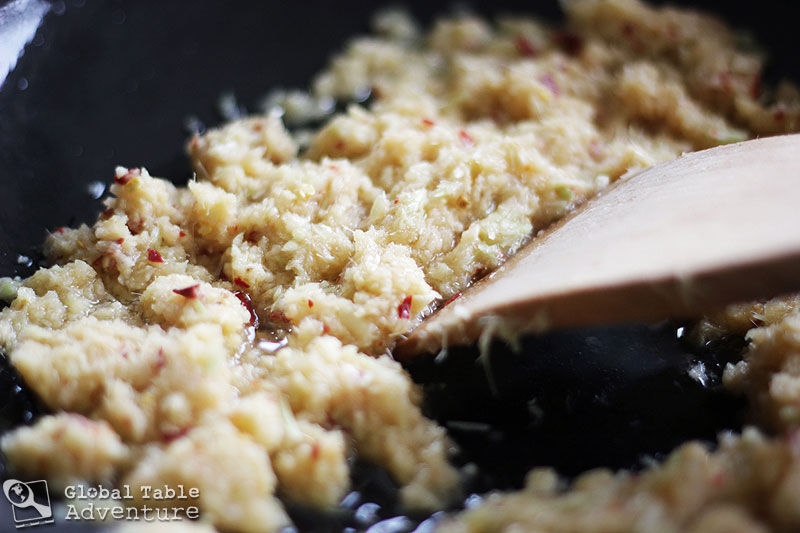 2. Heat the coconut oil up in a large wok and add the seasoning paste. Fry until fragrant and softened, 2-3 minutes.