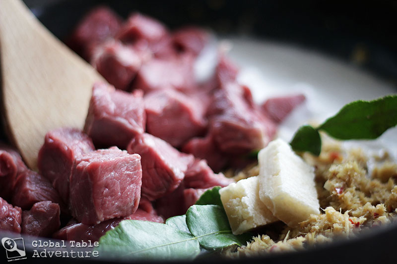 Heat the coconut oil up in a large wok and add the seasoning paste. Fry until fragrant and softened, 2-3 minutes.Next, add on the beef, coconut milk, water, sugar, and kaffir lime leaves.
