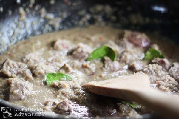 3. Next, add on the beef, coconut milk, water, sugar, and kaffir lime leaves. Give it a stir and let simmer for about an hour.
