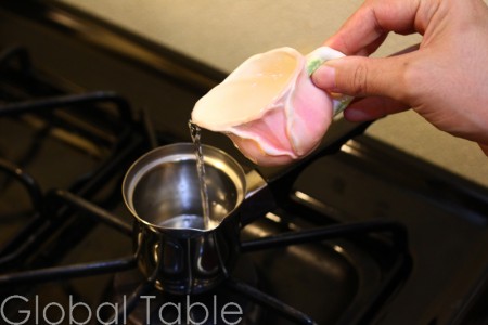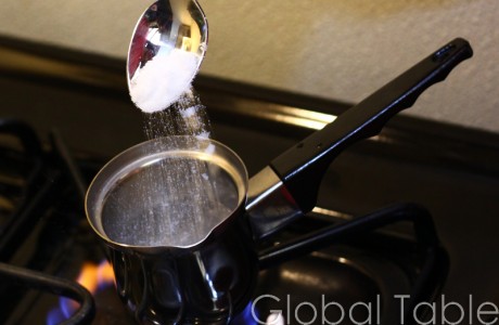 - Fill djezva (or small saucepan) with water. Bring to a simmer. Add sugar and heat over low until dissolved.
