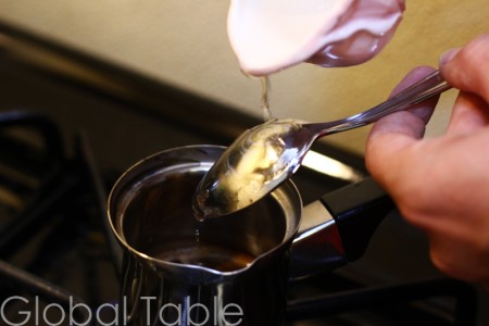 6. Pour the reserved sugar water back into the djezva (pour the liquid over spoon to rinse it off). The gentle pouring action helps bring all the coffee grounds to the bottom of the djezva. You may want to let the coffee rest a few extra moments, for the grounds to settle to the bottom.