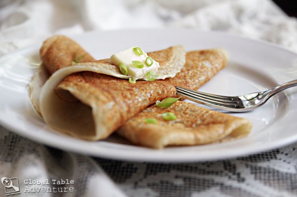 Cook in a little butter in a pan over medium/medium-high; pour into the preheated non-stick pan, rolling the batter around like a crepe (it will be a little thicker – somewhere between a crepe and a pancake).