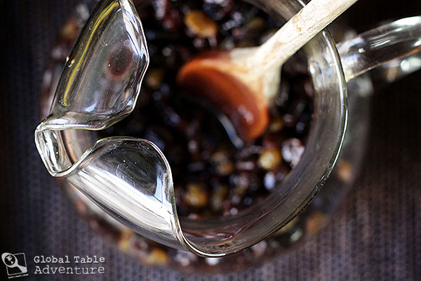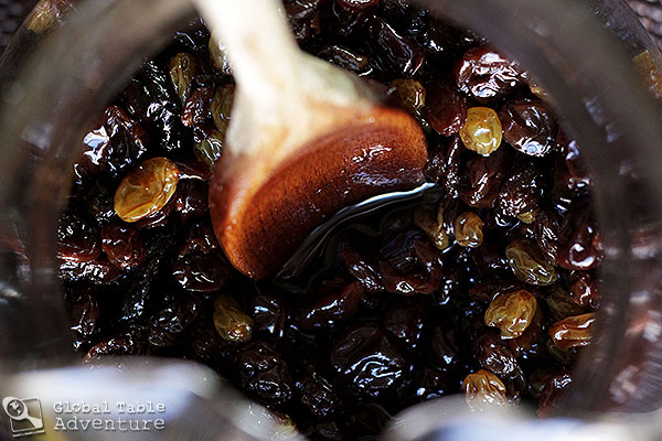 1. Marinate a mountain of dried fruit in rum and cherry brandy for 1-3 days, stirring occasionally (or as long as you can stand to wait). They’ll plump up and, if you sneak a few nibbles (please do!), you’ll find they taste like cherry rum smiles.
