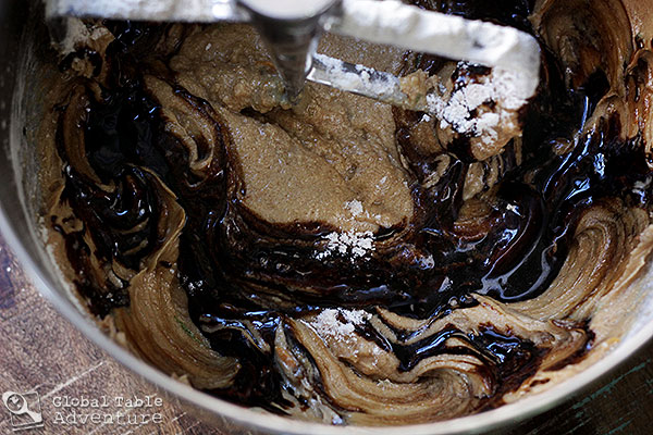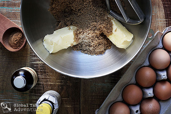 4. Cream the softened butter and brown sugar together in a standing mixer, then add eggs one at a time, scraping sides as needed. Beat in zest, vanilla, bitters, and molasses.